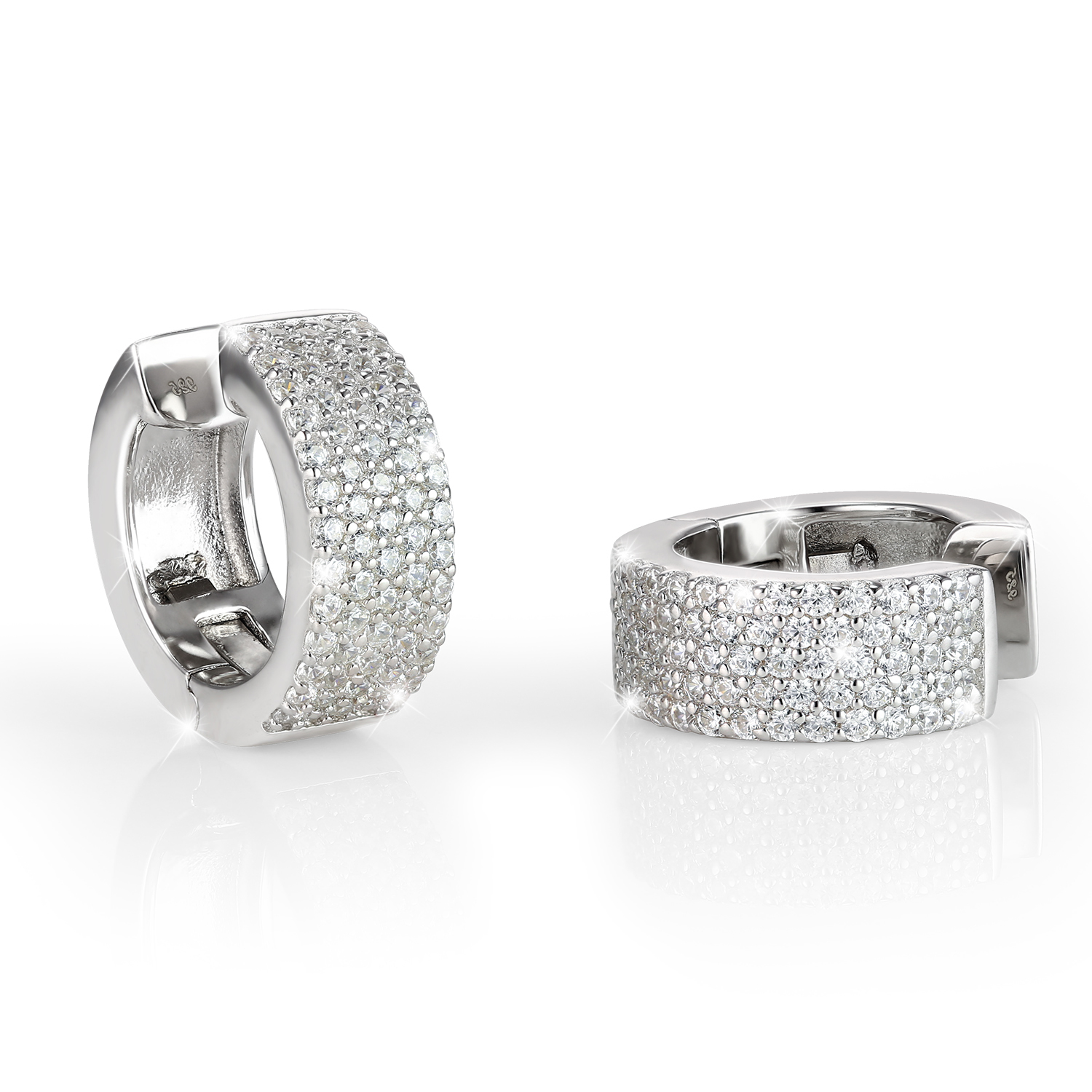 Die eleganten Creolen ‚Silber‘ sind aus zahlreichen Zirkonia in bester 5A Qualität gefertigt. Perfekt kombinierbar zu Jeans mit Pulli oder zum klassischen Minirock für die nächste Party. Diese wunderschönen Ohrringe komplementieren einfach jedes Outfit.